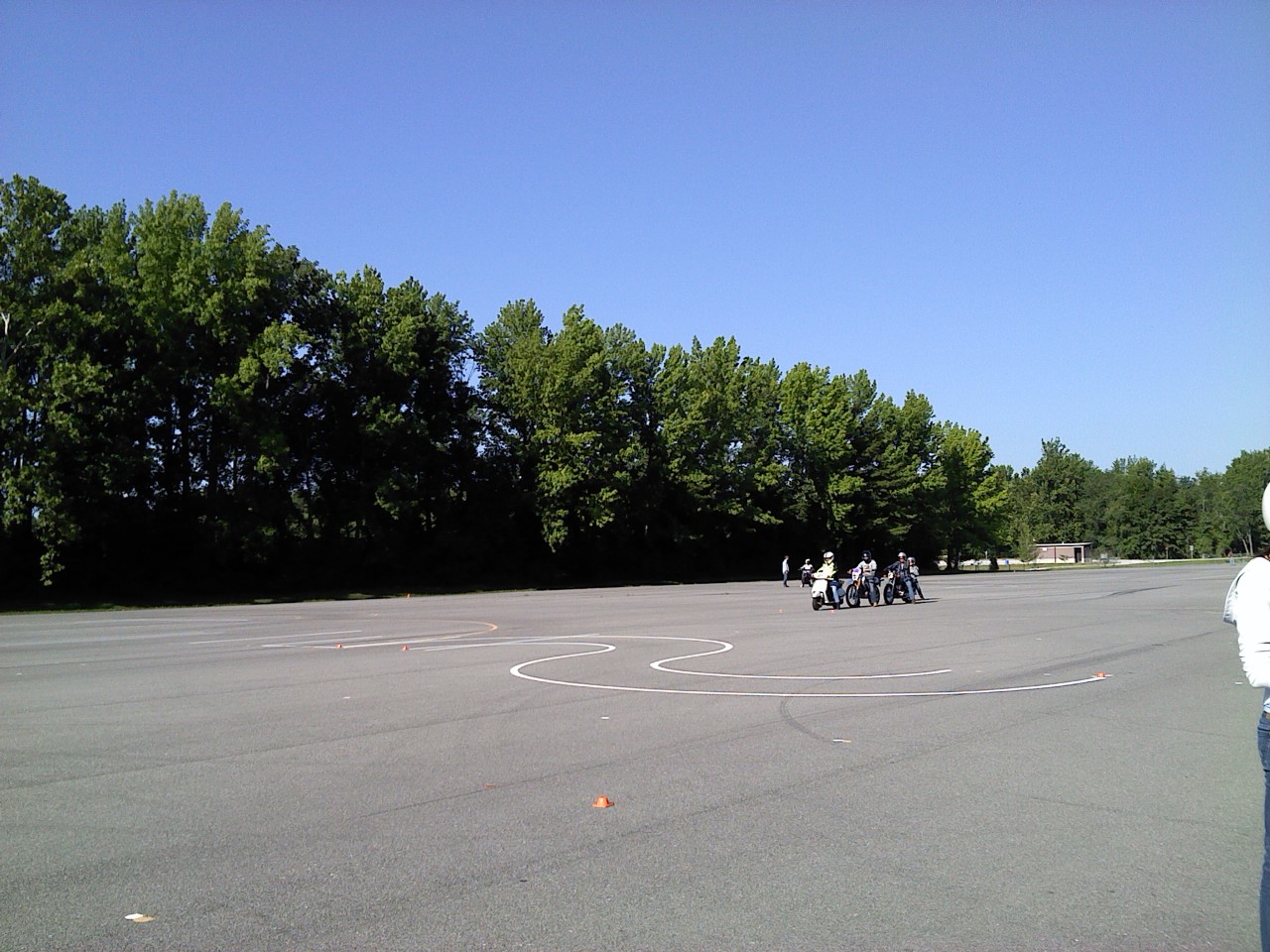 What we did over the course of the morning...Damn, we did a LOT of exercises. Lots of swerving and curves. I'm proud to say that I did really well on the sudden stop exercise. Kind of ironic. The most challenging was the stupid U-turn box. We had to do figure 8 U-turns. I went wide. Very, very wide. I know it will be on the final test tomorrow. Let's all pray that I kick-ass on everything else so that when I screw it up it won't completely tank me.